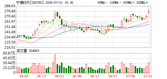 证券时报·数据宝统计显示,宁德时代今日收盘价为279.66元,上涨3.12%,日换手率为0.83%,成交额为90.47亿元,全天主力资金净流入11.45亿元,近5日该股累计上涨4.16%,近5日资金合计净流入8.22亿元。