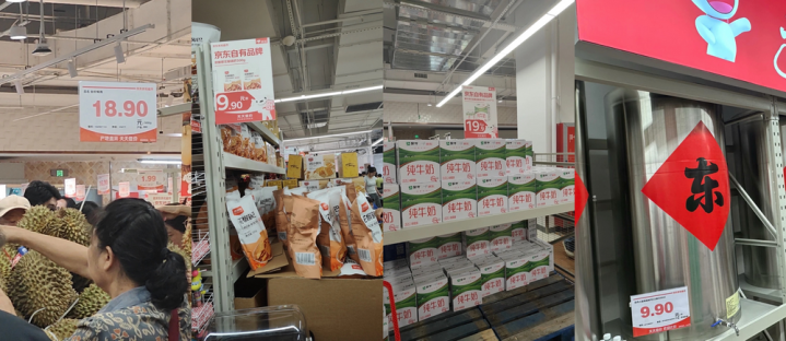 定位“折扣超市”,吸引消费者的自然是低价、高性价比。记者了解到,9.9元/30枚鲜鸡蛋、7.99元/24瓶纯净水、18.9元/斤的金枕榴莲、5.99元/斤的猪前尖肉、9.9元的白酒等均是京东折扣超市的爆品,开业当日多款商品都被抢购一空。相关讨论区,不少网友都在询问鸡蛋、榴莲补货进度。